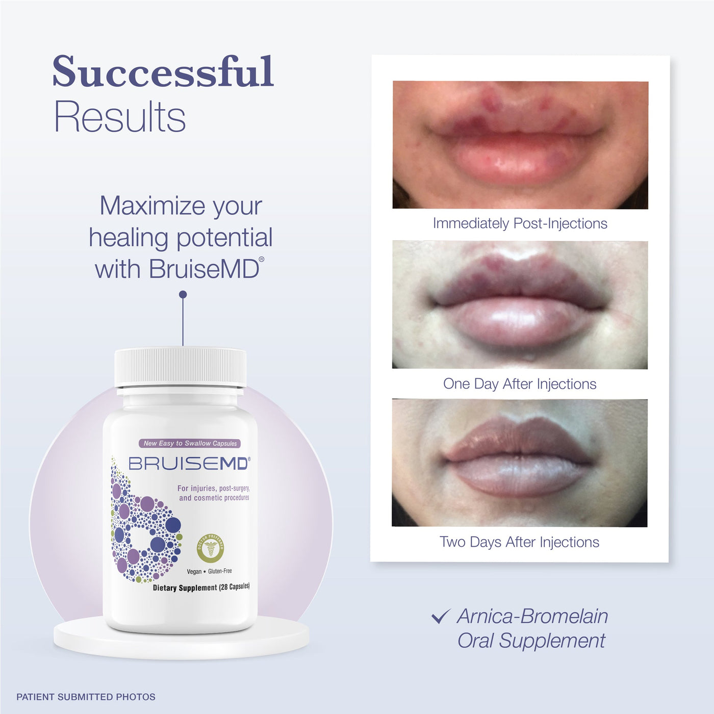 BruiseMD provides nutritional support for the normal body functions of healing. It features Arnica montana blossom and bromelain, an enzyme found in the stem of pineapples. Additional ingredients include Grapeseed Extract, Vitamin C, Zinc, Rutin, and multiple Citrus Bioflavinoids. These ingredients go to work quickly to enhance your body's ability to reduce swelling and bruising related to surgery, cosmetic procedures, or injuries.*